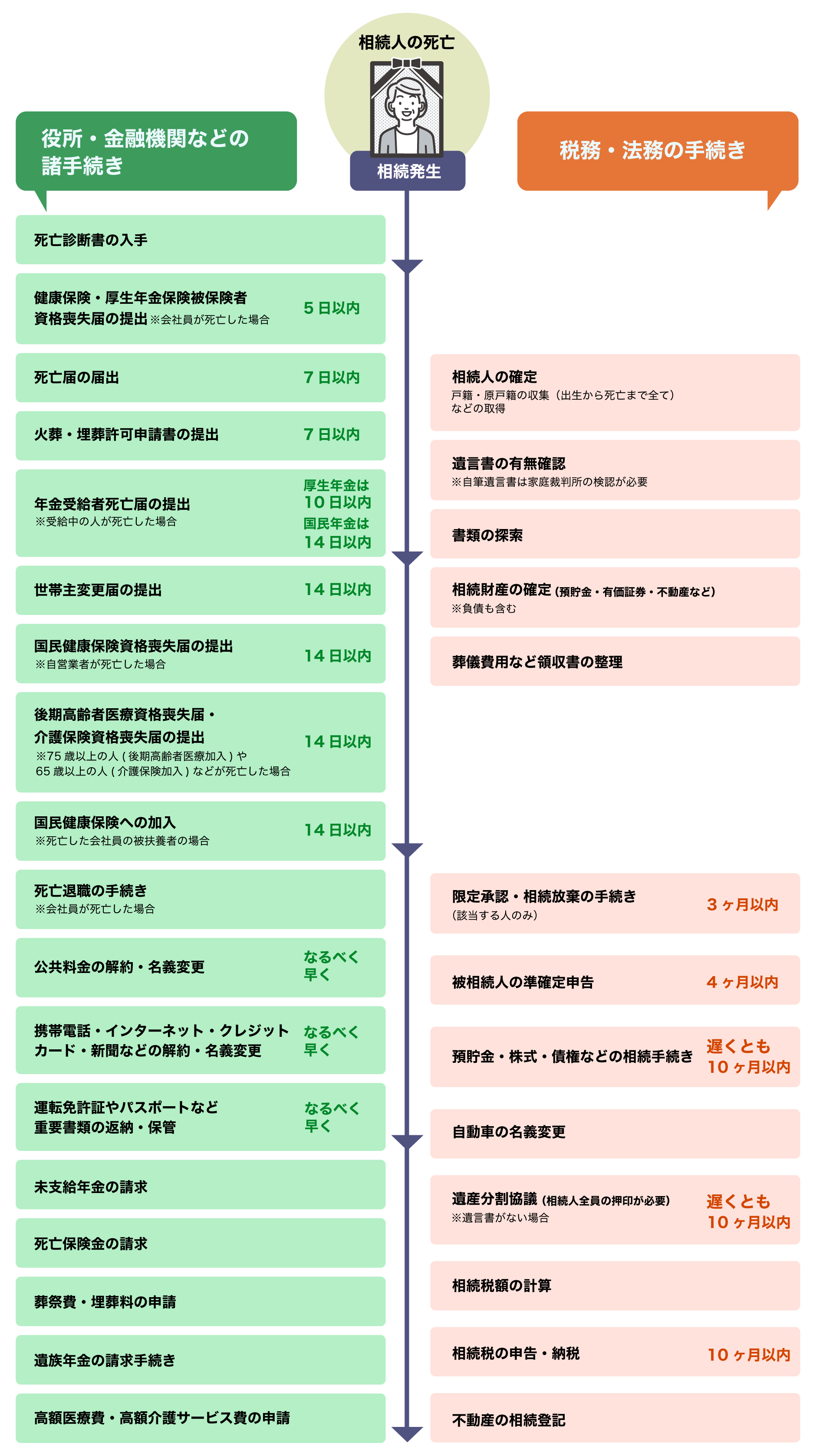 下記の「手続きのスケジュール」等を参考に、誰が・いつまでに・どこで・何をするのかを整理してみましょう。 できるところはご自身で進め、難しい内容は専門家に任せることで、不安をぐっと減らすことができます。